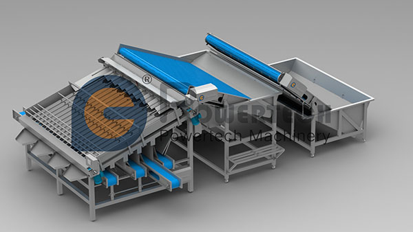 Una gran cantidad de camarones crudos son transportados por un transportador de dos grados, los cuales están dispuestos de manera ordenada a la superficie de trabajo de la máquina clasificadora.Cada dos rodillos circulares clasificados, un grupo gira bajo el motor de accionamiento, los diferentes tamaños de camarones se clasifican por los diferentes espacios entre cada dos rodillos, y luego se recolectan después del transporte.