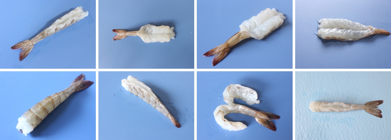 Después de ser procesados por una máquina peladora automática de camarones, los camarones sin cabeza se procesan en los siguientes estilos: